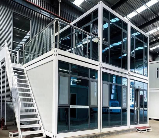 It features an upper and lower two-story layout with an external staircase for efficient use of vertical space. It can serve as a temporary office area (e.g., mobile offices on construction sites or in parks) or be converted into a small multifunctional space (such as an exhibition hall or a leisure station). The modular design allows for quick assembly and flexible relocation, while the glass curtain walls provide both natural lighting and panoramic views, making the interior bright and transparent.